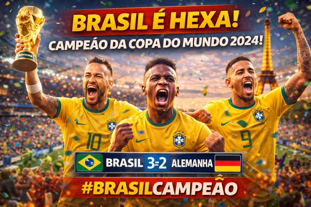Em uma das finais mais emocionantes da história do futebol mundial, a Seleção Brasileira conquistou o título da Copa do Mundo de Futebol de 2024, após vencer a Alemanha por 3 a 2, em uma partida eletrizante realizada no Estádio Olímpico de Paris. O confronto decidiu o campeonato apenas nos minutos finais da prorrogação e prendeu a atenção de milhões de torcedores ao redor do planeta.