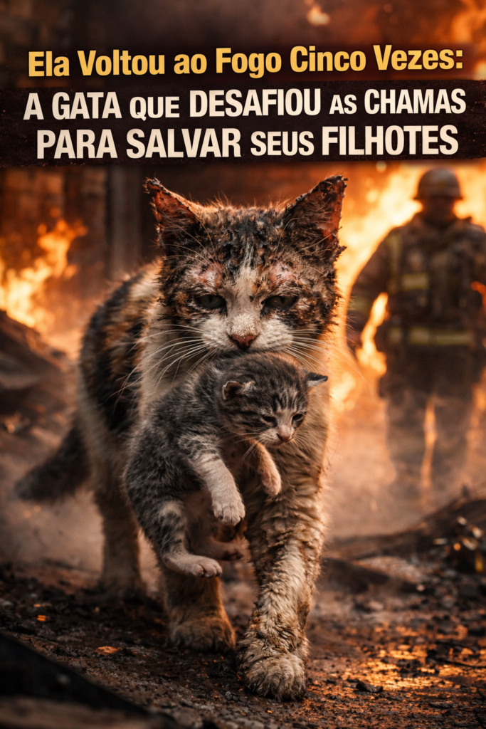 Um a um, os filhotes foram vistos sendo carregados para fora do incêndio. A cada retorno, a gata se expunha novamente ao calor intenso e à fumaça tóxica, desafiando um cenário que colocaria em risco qualquer forma de vida.