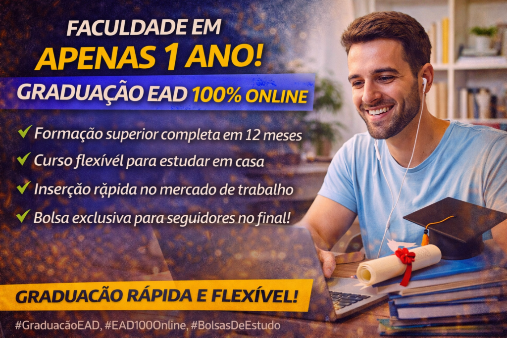 #GraduaçãoEAD, #EAD100Online, #FaculdadeEm1Ano, #EnsinoSuperior, #EducaçãoADistância, #MercadoDeTrabalho, #FaculdadeOnline, #BolsasDeEstudo, #EstudarEmCasa, #FormaçãoRápida