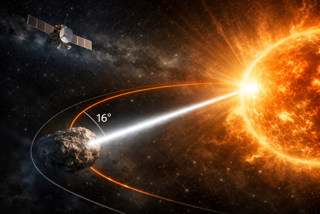 Durante sua passagem próxima ao Sol, o 3I/ATLAS teve sua trajetória alterada de forma significativa. A mudança angular de cerca de 16° é compatível com efeitos gravitacionais intensos, algo esperado em encontros tão próximos com nossa estrela.