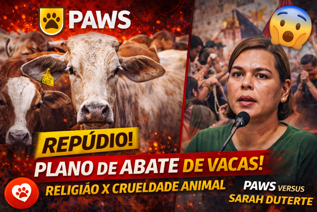 A Sociedade Filipina de Bem-Estar Animal (PAWS) divulgou uma nota oficial condenando duramente o plano anunciado pela vice-presidente das Filipinas, Sarah Duterte, que prevê o abate de 100 vacas durante uma manifestação de oração contra a corrupção no país.
